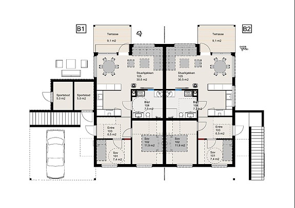 Frittstående carport som er felles for B2, B3 og B4, men separate sportsboder.
