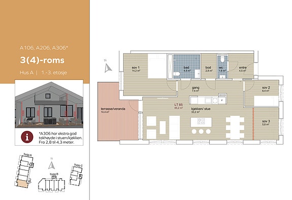 Vannbåren gulvvarme i alle rom bortsett fra soverom og bod