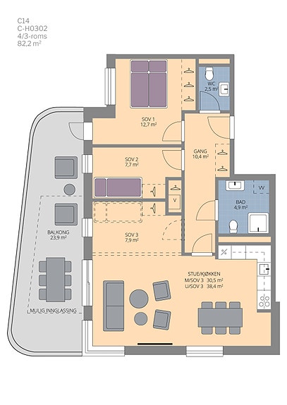 Tilkomst til leilighetene er tilpasset rullestolbrukere med heis/trapp fra parkeringsanlegg/ inngang og med adkomst til hvert plan. For de fleste leilighetene tilfredsstiller planløsningen krav om tilgjengelighet. Unntakene fremkommer av prospekt. Vist møblering er ut ifra plassering av snusirkel for rullestol og kan endres av den enkelte. TEK 17 gjelder.