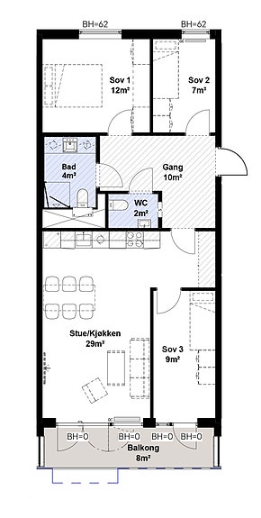 Arealeffektiv 4-roms leilighet med sydvest vendt balkong inn mot gårdstun. Eget gjestetoalett. Heis.