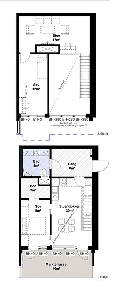3-roms leilighet over 2 plan med bl.a. allrom/kjøkken og egen stuedel. Sydvendt markterrasse på 14 kvm.