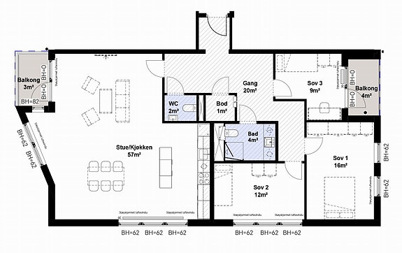 Vanlig netto etasjehøyde i leilighetene blir ca. 2,5 meter. Deler av himlingen vil bli nedsenket med en takhøyde på minimum 2,2 meter pga. tekniske føringer. Dette er typisk i gang, bad og bod. Over kjøkkenskap vil det være en innkassing for ventilasjonskanalen for avtrekksvifte.