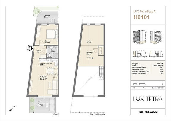 Luftig 2-roms endeleilighet med mezzanin og to herlige terrasser. Trappefri adkomst. Unikt LUX-konsept. Midt i sentrum