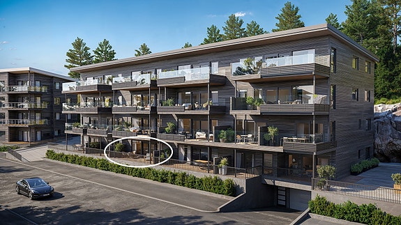 Flotte 3-roms leiligheter i første etasje. Dette er gode leiligheter med to soverom og romslig bad med eget vaskerom bak skyvedør. Leilighetene har romslige stuer med utgang til flotte, store terrasser med godt med sol hele dagen.