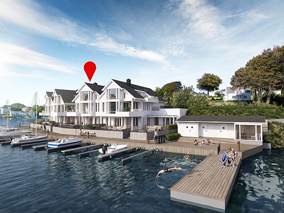 På sørenden av bryggen ligger sameiets eget badehus med badstue, wc og dusj. Illustrasjon.jpg
