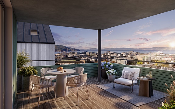Innvendig varierer leilighetene i størrelse fra 44 til 223 kvm. Her får du ekstra god takhøyde, og de store vindusflatene gir deg massevis av dagslys. Romslige balkonger og terrasser inviterer deg til å nyte ettermiddagssola og utsikten over byen, fjorden eller de sjarmerende trehusene.