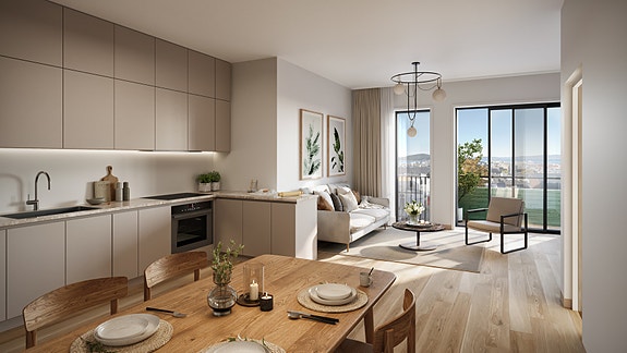 Hvis du liker deg i høyden, kan en av toppleilighetene være noe for deg. De går over to etasjer, og har ekstra store terrasser og eksklusive materialer - som fiskebeinsparkett i eik og kjøkkenbenker i stein. Utbyggerens kvalitetsfokus gjenspeiles selvfølgelig også i de øvrige leilighetene. De største leilighetene kan også tilpasses med gasspeis og vinrom, som en del av tilvalgsprosessen.