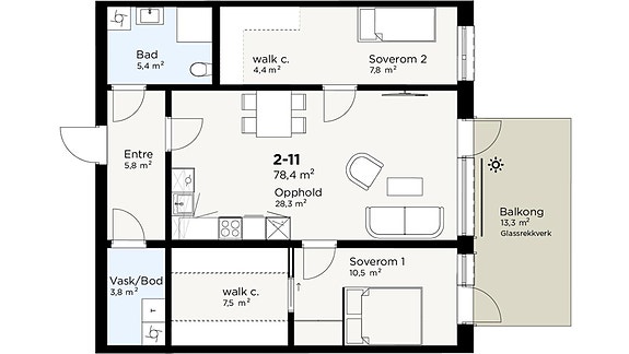 2.etasje: Entré, stue, kjøkken, 2 soverom, walk c., bad, vaskerom/bod og balkong.