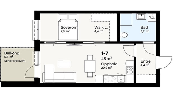 Velkommen til leilighet 1-7 i Lille Bytorget. En praktisk 2-roms leilighet på 47,5 kvm i 1. etasje. Nord-vestvendt balkong på 6 kvm samt bod i kjeller på 2,5 kvm. Laminatgulv i oppholdsrom og bad med fliser og innredning på 60 cm bredde.