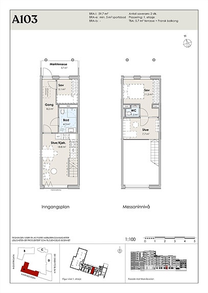 Tøff, gjennomgående studioleilighet i 1.etg med messanin og mye lys. 2 soverom, stue/kjøkken og tv-stue. Markterrasse og direkte inngang fra det grønne atriet bak, mellom byggene. I tillegg fransk balkong ut mot Marviksveien, godt over bakkeplan.