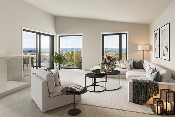 Her leveres tak og vegger med malt gips i farge Washed Linen. Gulv leveres med 3-stavs eikeparkett. Karmer på vinduer og balkongdører leveres i farge Dempet Sort. Alt listverk og utforinger blir levert i farge Bomull. Trapp leveres med hvitmalte vanger og håndlist, glassrekkverk og trinn i eik. Det er mulig å gjøre endringer i leveransen..
