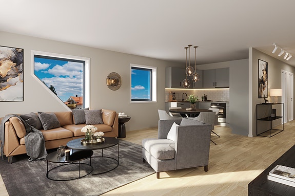 Vegger og tak leveres med malt gips i farge Washed Linen og gulv med 3-stavs hvitlasert eikeparkett. Det er mulig å gjøre endringer i leveransen. Integrerte hvitevarer er inkludert i leveransen. Ventilator med plasmafilter.