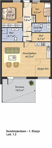 Velkommen til drømmeleiligheten på bakkeplan! Her får du en romslig gang med rikelig skapplass, et lekkert bad med dusj og wc, samt et praktisk vaskerom med wc. To romslige soverom gir god plass til deg og din familie, og du har muligheten til å utnytte et ekstra soverom etter dine behov. I den store stuen med åpen kjøkkenløsning kan du trives og samle dine kjære, og fra terrassen/hagen kan du nyte utendørslivet i rolige omgivelser. En perfekt kombinasjon av stil, funksjonalitet og komfort!