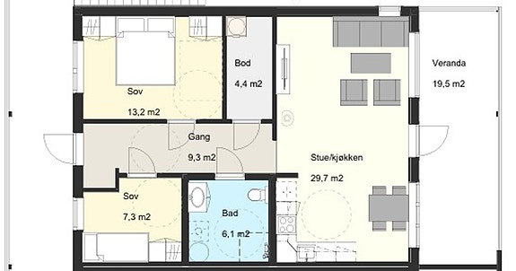 Entre, bad, bod, 2 soverom og stue/kjøkken.