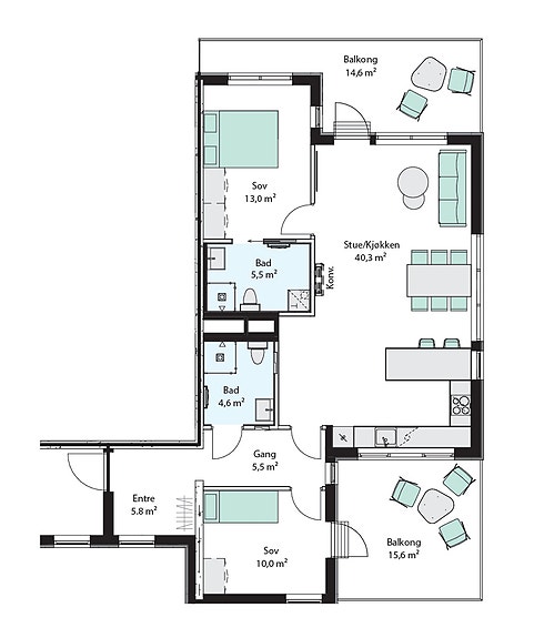 Lys ende-leilighet med to terrasser