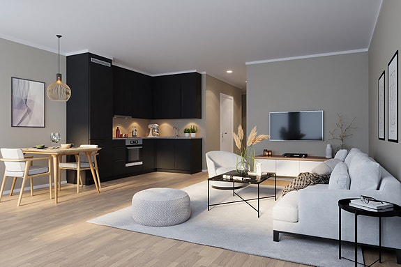 En 2‑romsleilighet består av åpen stue- og kjøkkenløsning, soverom, romslig bad, entré og bod.