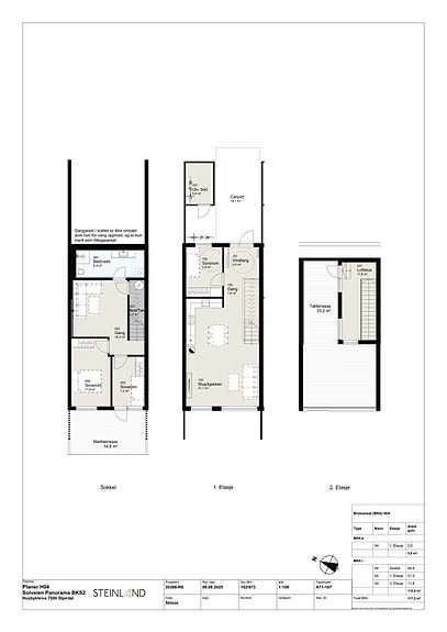 sjøutsikt, samt splitter ny og moderne standard. De innholdsrike rekkehusene går over 2 plan og har totalt 3 soverom, og byr på gjennomtenkt planløsning. I tillegg vil hver bolig få egen takterrasse samt markterrasse balkong, noe som totalt utgjør over 50 m2 uteareal. Parkering i egen carport.
