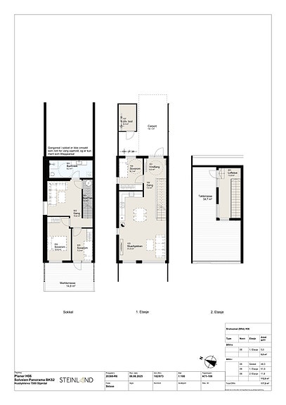 sjøutsikt, samt splitter ny og moderne standard. De innholdsrike rekkehusene går over 2 plan og har totalt 3 soverom, og byr på gjennomtenkt planløsning. I tillegg vil hver bolig få egen takterrasse samt markterrasse balkong, noe som totalt utgjør over 50 m2 uteareal. Parkering i egen carport.