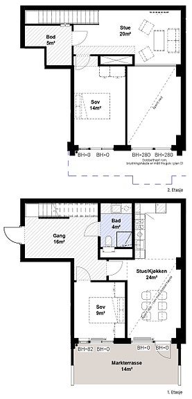 Innholdsrik og spesiell 3-roms leilighet over 2 plan med bl.a. delvis åpent mellom etasjene. Markterrasse på 14 kvm.