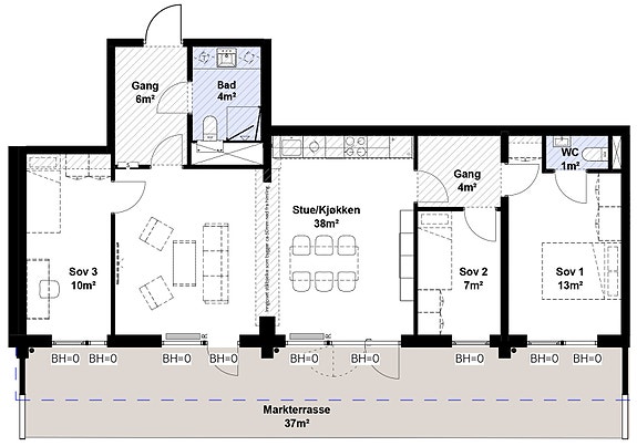 4-roms leilighet med romslig stue/kjøkken med direkte utgang til stor vestvendt markterrasse på 37 kvm.