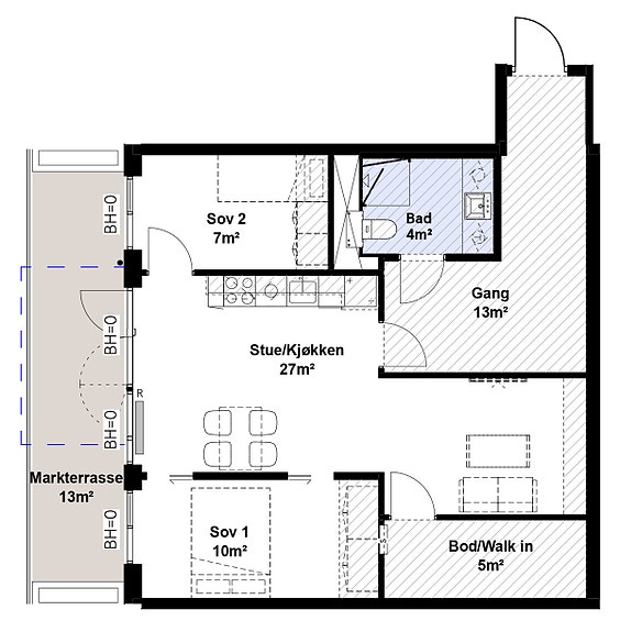 Super 3-roms leilighet med delvis adskilt stue og kjøkken. Utgang til vesvendt markterrasse på 13 kvm. fra stuen
