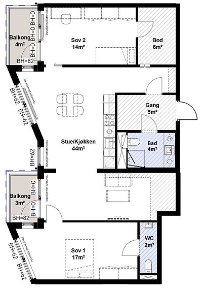 3-roms leilighet med spennede utforming. Stort spiseskjøkken og egen stuedel med 2 vestvendte balkonger