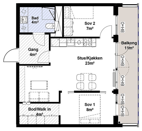Vanlig netto etasjehøyde i leilighetene blir ca. 2,5 meter. Deler av himlingen vil bli nedsenket med en takhøyde på minimum 2,2 meter pga. tekniske føringer. Dette er typisk i gang, bad og bod. Over kjøkkenskap vil det være en innkassing for ventilasjonskanalen for avtrekksvifte.