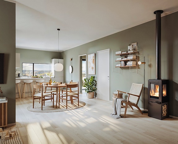 Åpen stue- og kjøkkenløsning i 1.etasje med utgang til flere uteplasser (Illustrasjonsbilde).