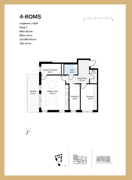 Arealet er beregnet ut fra Norsk standard NS 3940:2023. BRA-i: Internt arealet innenfor boligens omsluttende vegger, inkludert sjakt. BRA-e: Eksternt areal som boligen har eksklusiv bruksrett til, men som ikke ligger i boligen, f.eks. kjellerbod. BRA-b: Areal for innglasset balkong med veggareal. Total BRA = Summen av BRA-i, BRA-e og BRA-b. TBA er areal på terrasse og balkong. Arealet oppgis ved salg, men inngår ikke i BRA. Oppgitt romareal er netto romareal. De oppgitte arealer er å betrakte som cirka-arealer. Partene har ingen krav mot hverandre dersom arealet skulle vise seg å være 5 % mindre / større enn det oppgitte areal.
