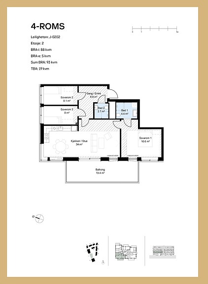 Arealet er beregnet ut fra Norsk standard NS 3940:2023. BRA-i: Internt arealet innenfor boligens omsluttende vegger, inkludert sjakt. BRA-e: Eksternt areal som boligen har eksklusiv bruksrett til, men som ikke ligger i boligen, f.eks. kjellerbod. BRA-b: Areal for innglasset balkong med veggareal. Total BRA = Summen av BRA-i, BRA-e og BRA-b. TBA er areal på terrasse og balkong. Arealet oppgis ved salg, men inngår ikke i BRA. Oppgitt romareal er netto romareal. De oppgitte arealer er å betrakte som cirka-arealer. Partene har ingen krav mot hverandre dersom arealet skulle vise seg å være 5 % mindre / større enn det oppgitte areal.