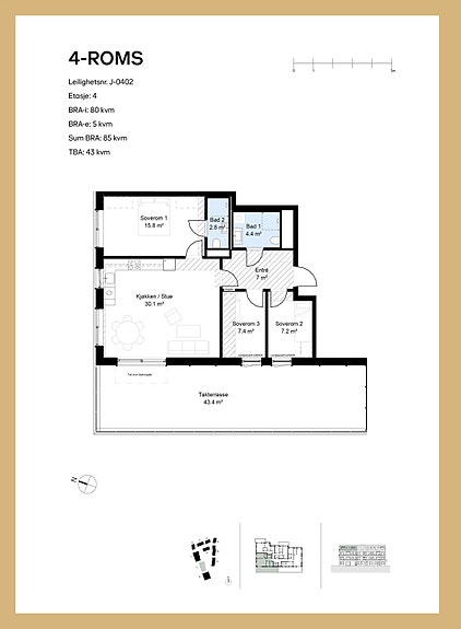 J0402 er en arealsmart 4-roms toppleilighet med vestvendt, privat takterrasse på hele 43 kvm. Leiligheten inneholder 3 soverom og 2 bad, hvorav det ene er direkte tilknyttet hovedsoverommet. Videre er det en åpen stue- kjøkkenløsning med utgang til privat takterrasse på hele 43 kvm.
