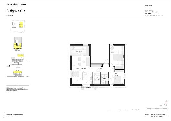 Arealet er beregnet ut fra Norsk standard NS 3940:2023. BRA-i: Internt arealet innenfor boligens omsluttende vegger, inkludert sjakt. BRA-e: Eksternt areal som boligen har eksklusiv bruksrett til, men som ikke ligger i boligen, f.eks. kjellerbod. BRA-b: Areal for innglasset balkong med veggareal. Total BRA = Summen av BRA-i, BRA-e og BRA-b. TBA er areal på terrasse og balkong. Arealet oppgis ved salg, men inngår ikke i BRA. Oppgitt romareal er netto romareal. De oppgitte arealer er å betrakte som cirka-arealer. Partene har ingen krav mot hverandre dersom arealet skulle vise seg å være 5 % mindre / større enn det oppgitte areal.