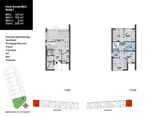 Delfelt BK2 teller åtte effektive rekkehus. Fire og fire, annenhver bolig, er identiske. Forskjellen på de to variantene er mest størrelsen - og den er bare ni kvadrat. Faller du for disse boligene, er det mest plasseringen i rekka som blir tema i familierådet.