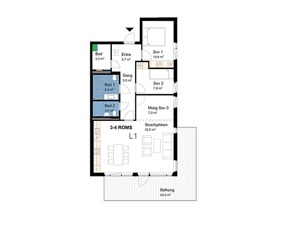 Primærrom: 86,10 kvm, BRA-i: 86,10 kvm , TBA: 24 kvm