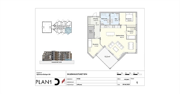 Plantegning på leilighet 104 datert 29.04.2025.