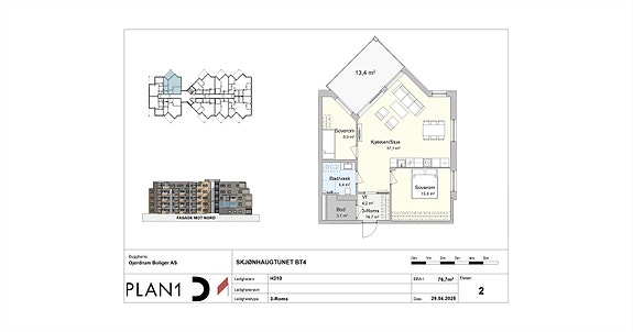 Plantegning på leilighet 210 datert 29.04.2025.