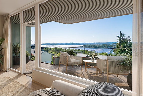 En romslig og solrik balkong og terrasse på 86 kvm gir ekstra komfort til utelivet. Her kan man nyte solen fra tidlig morgen til sen kveld.