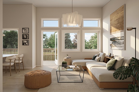 Dette er romslige leiligheter på ca. 74 m2 BRA i. Fra entréen er det direkte inngang til badet, oppholdsrommet og to gode soverom. Både i entréen og på soverommene er det god plass til å sette inn garderobe. Stue og kjøkkenrommet er på ca. 29 kvadratmeter, med kjøkkeninnredningen praktisk plassert i det ene hjørnet. Det inviterer til hyggelige matopplevelser, med sin gode benkeplass! Også her er det utgang til uteplassen fra stuen - en ca. 24 kvadrat stor terrasse i første, eller en ca. 13 kvadrat stor balkong i andre.