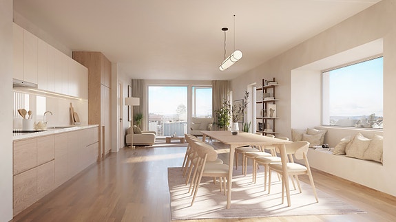 Det er tatt gode materialvalg både utvendig og innvendig, det leveres bl.a. med 1-stavs eikeparkett. Illustrasjon fra A406- avvik vil forekomme.