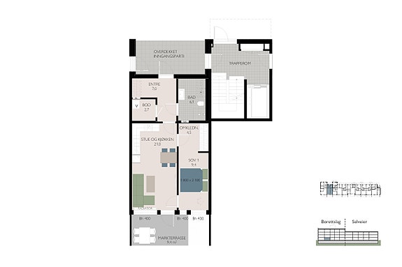 Det er også god plass til oppbevaring i leiligheten; én bod innvendig på 2,7 kvm og plass til garderobeskap like innenfor inngangsdøren, ideell for yttertøy og oppbevaring.