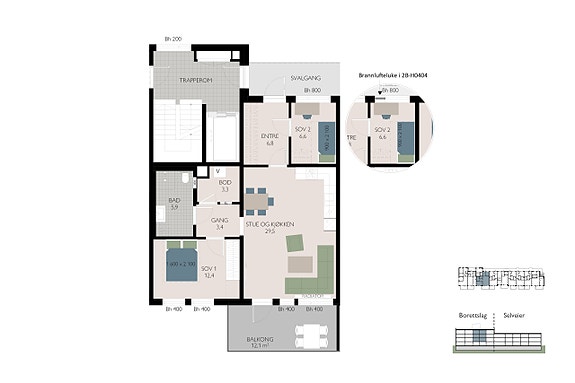 • Romslig 3-roms leilighet med adkomst fra svalgang