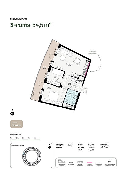Lnr. 3032 - Fin 3-roms med vestvendt balkong