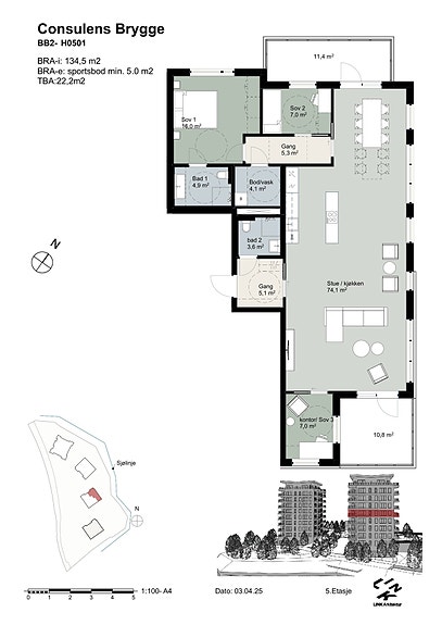 5.etg: Gang, to bad, bod/vask, tre soverom og stue/kjøkken + to balkonger.