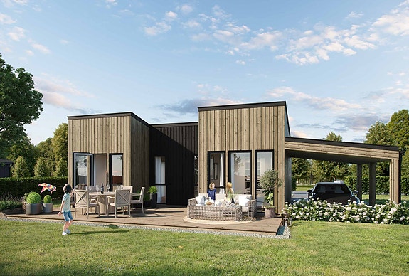 Moderne og arealeffektiv hus midt på tomten med 2 soverom og carport på eiet tomt.