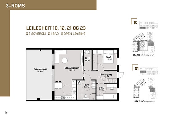 3-roms leilegheitene er utforma for å treffe kjøpargrupper i alle fasar i livet. Her har vi laga forskjellige leilegheiter med ulik storleik og utforming for å gje størst mogleg fridom til å velje det som treff deg og dine behov.