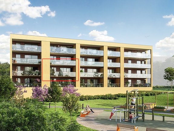 Leiligheten har to soverom, et godt bad og en stor innvendig bod med god lagringsplass. Inngang fra solrik svalgang, perfekt for å nyte morgensolen med en kopp kaffe. Stuebalkongen vender mot grønne fellesområder og kan innglasses for helårsbruk.