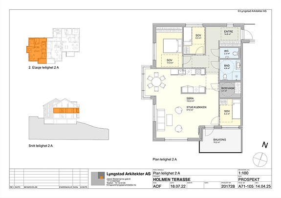 Det gjøres oppmerksom på at frihåndstegninger, perspektiver, utomhusplan, plantegninger og bilder i prospektet er av illustrativ karakter og inneholder derfor detaljer som farger, innredninger, møblering, beplantning og arkitektoniske detaljer m.v. som ikke inngår i leveransen. Stiplede løsninger/ innredninger leveres ikke. Plantegninger og illustrasjoner som viser ulike innredningsløsninger er ment som illustrasjoner for mulige løsninger. Disse løsningene inngår ikke i standardleveransen. Tegningene i prospektet bør ikke benyttes som grunnlag for nøyaktig møbelstilling, da målestokkavvik kan forekomme ved trykking/ kopiering. Det tas forbehold om at sjakter og føringsveier for VVS-installasjoner kan bli endret. Entreprenøren har ansvaret for oppfølging av gjeldende krav, lover og forskrifter.