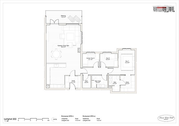 4-roms med BRA på 126 / BRA-i 115,4 / BRA-e 10,6 / TBA 13,5 kvm i 3. etasje.