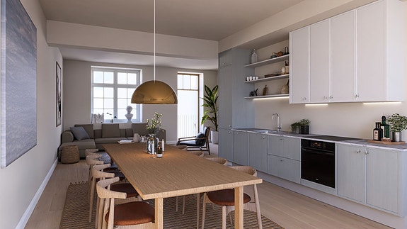Illustrasjon: Svane Kjøkkenet. Bildet viser kjøkkenleveransen fra Svane Kjøkkenet og er ment som en illustrasjon for å vise omfanget av kjøkkenleveransen. Andre illustrerte elementer er ikke en del av leveransen.