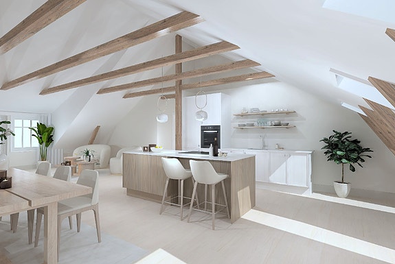 Særdeles innholdsrik hjørne-, topp- og endeleilighet med veggliv vendt mot sørvest, vest, nord-øst og nord. Et hjem for storfamilien midt i hjertet av Tønsberg. Leiligheten innehar hele tre soverom, to bad og mulighet for å benytte det tredje soverommet som bibliotek eller tv-stue. Et perfekt sted å nyte morgenkaffen og se byen våkne til liv utenfor. Stuen er på hele 70 m² og kombinert med en stedvis himlingshøyde på over 3,5 meter er luftig nesten en underdrivelse. Sjelden vare med flotte synlige takbjelker. Kjøkken fra danske Svane Kjøkkenet, modell New Tradition, forener tidløs estetikk og moderne arkitektur. Overflatene og den håndlagde finishen gir det hele en flott «touch» og henvender seg til de som verdsetter kvalitet og nytenkning. Det medfølger stekeovn, steketopp, oppvaskmaskin, ventilator med kullfilter og kombinert kjøl og fryseskap fra Miele.